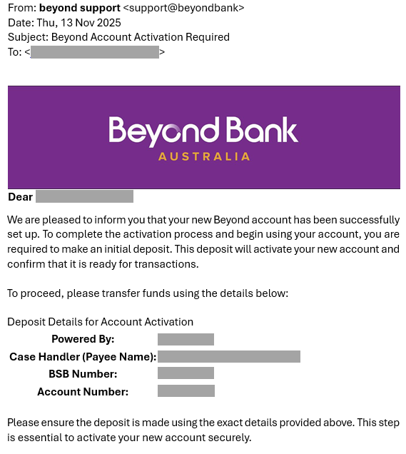 November 2025 – Beyond Bank email impersonation scam: Beyond Account Activation Required.