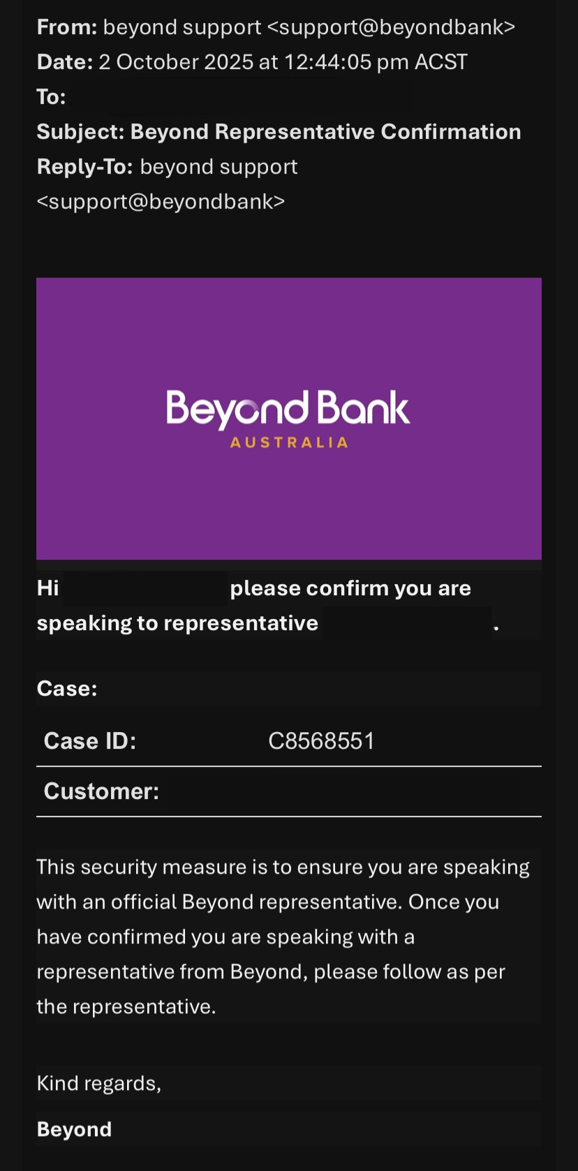 - you may also receive an email confirming you are speaking from an employee from “Beyond Bank”. This is not us.